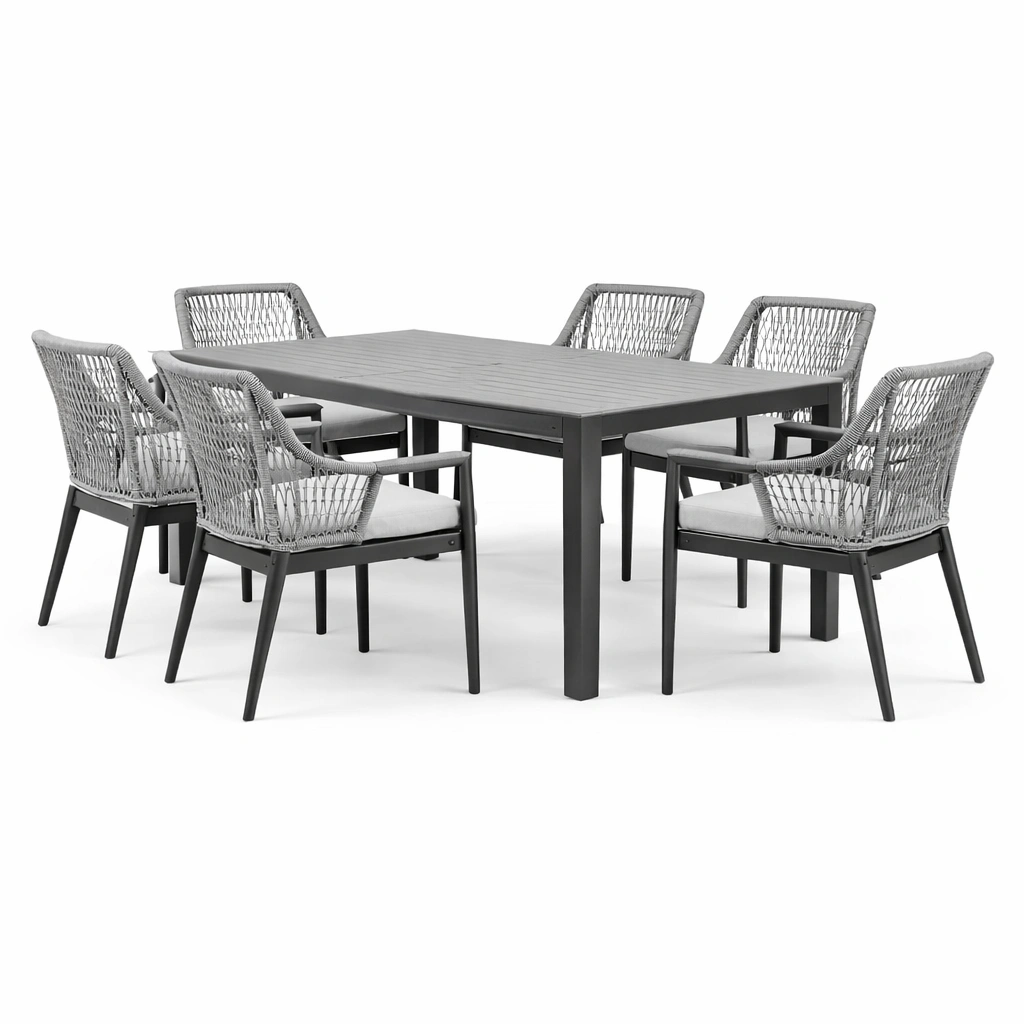 Conjunto de mesa y sillas de comedor exterior de aluminio y cuerda gris 180cm