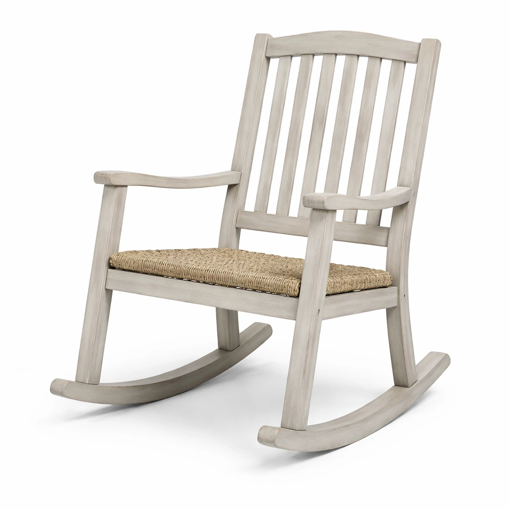 Mecedora compuesta por estructura de madera y asiento de mimbre. Dimensiones: altura 90 cm, ancho 65 cm, profundidad 100 cm. Peso neto: 7.5 kg. Capacidad de carga: 120 kg. Mantenimiento: limpiar con un paño seco.