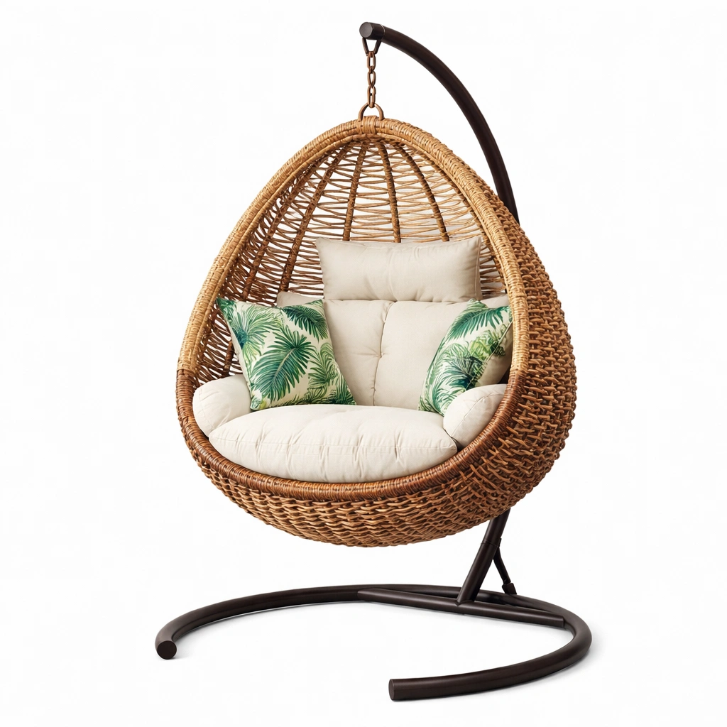 Material Principal: Ratán sintético. Cojines de algodón con diseño de hojas. Soporte de acero.