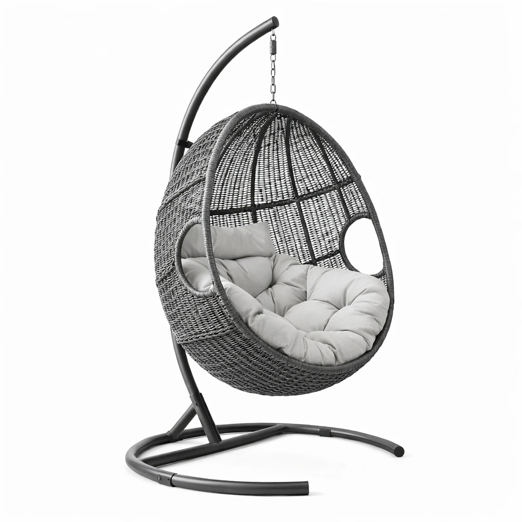 Esta silla colgante tiene una estructura de acero robusta y está tejida con ratán sintético. El cojín está hecho de poliéster y es desmontable y lavable. Las dimensiones del asiento son 80 cm x 80 cm x 120 cm y la altura total es de 195 cm. La silla soporta un peso máximo de 120 kg.